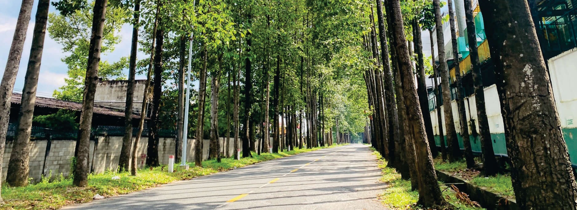 Giữa dòng xe hối hả và nhịp độ sản xuất bận rộn của Khu công nghiệp Biên Hòa 2, ít ai ngờ rằng lại tồn tại một "ốc đảo" xanh mát đến vậy. Nhiều người chỉ biết đến nơi đây qua những nhà máy, xưởng sản xuất, nhưng tôi đã may mắn tìm thấy một con đường tuyệt đẹp. Đó là một lá phổi xanh thực sự, nơi cây cối đan xen tạo thành vòm lá râm mát, che phủ cả một đoạn đường dài.